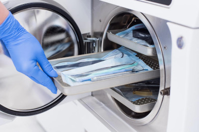 3- La stérilisation proprement dite : les instruments sont scellés sous pochette hermétique puis placés en stérilisateur (appelé autoclave). L’agent stérilisant est de la vapeur d’eau à pression élevée et à haute température. Après cette étape, ils sont stériles, c’est à dire que l’existence du moindre micro organisme sur un instrument est “hautement improbable” (la garantie à 100% est impossible).